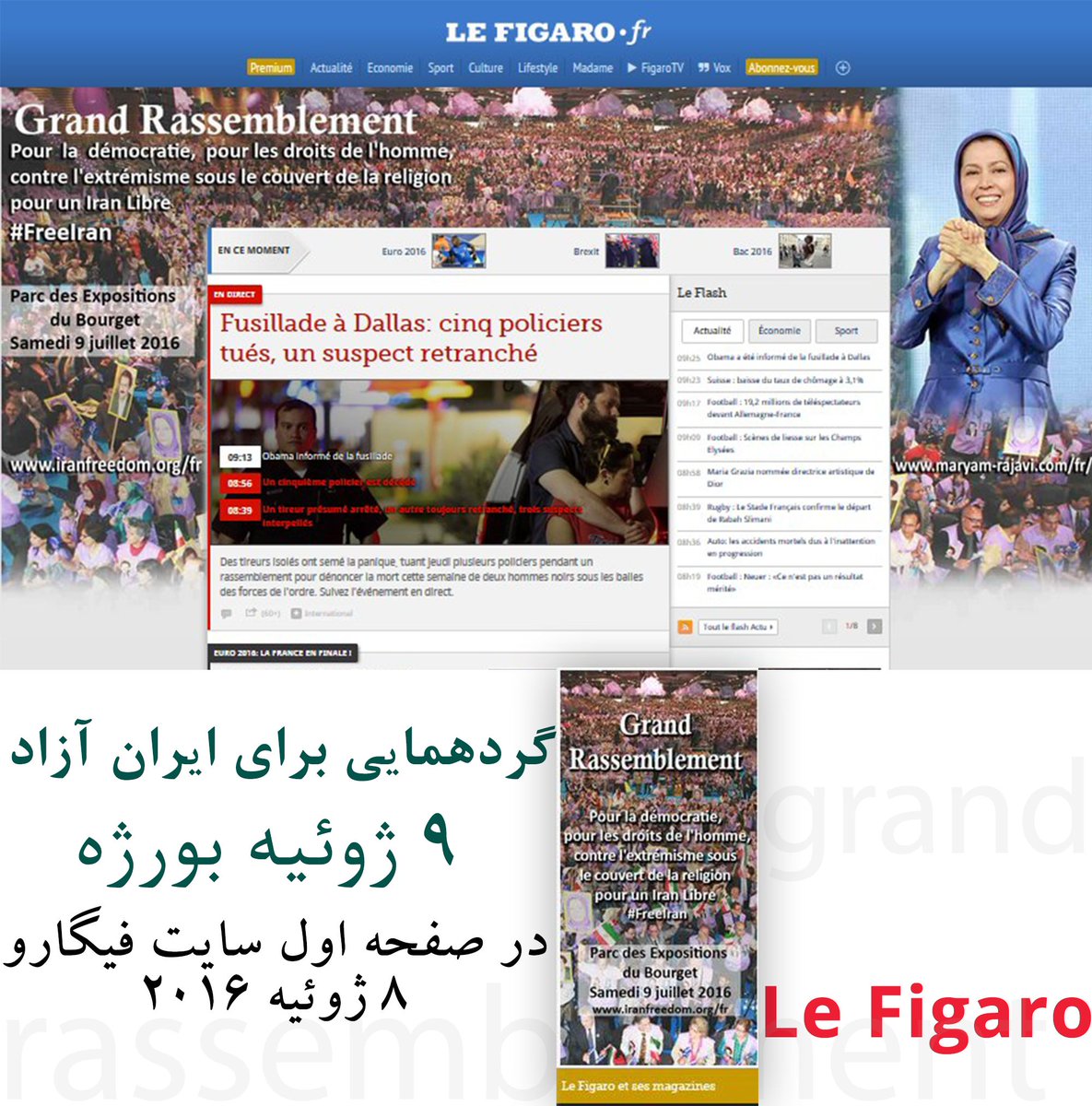 گردهمایی برای ایران آزاد شنبه 9 ژوئیه– بورژه,, درصفحه اول سایت فیگارو
