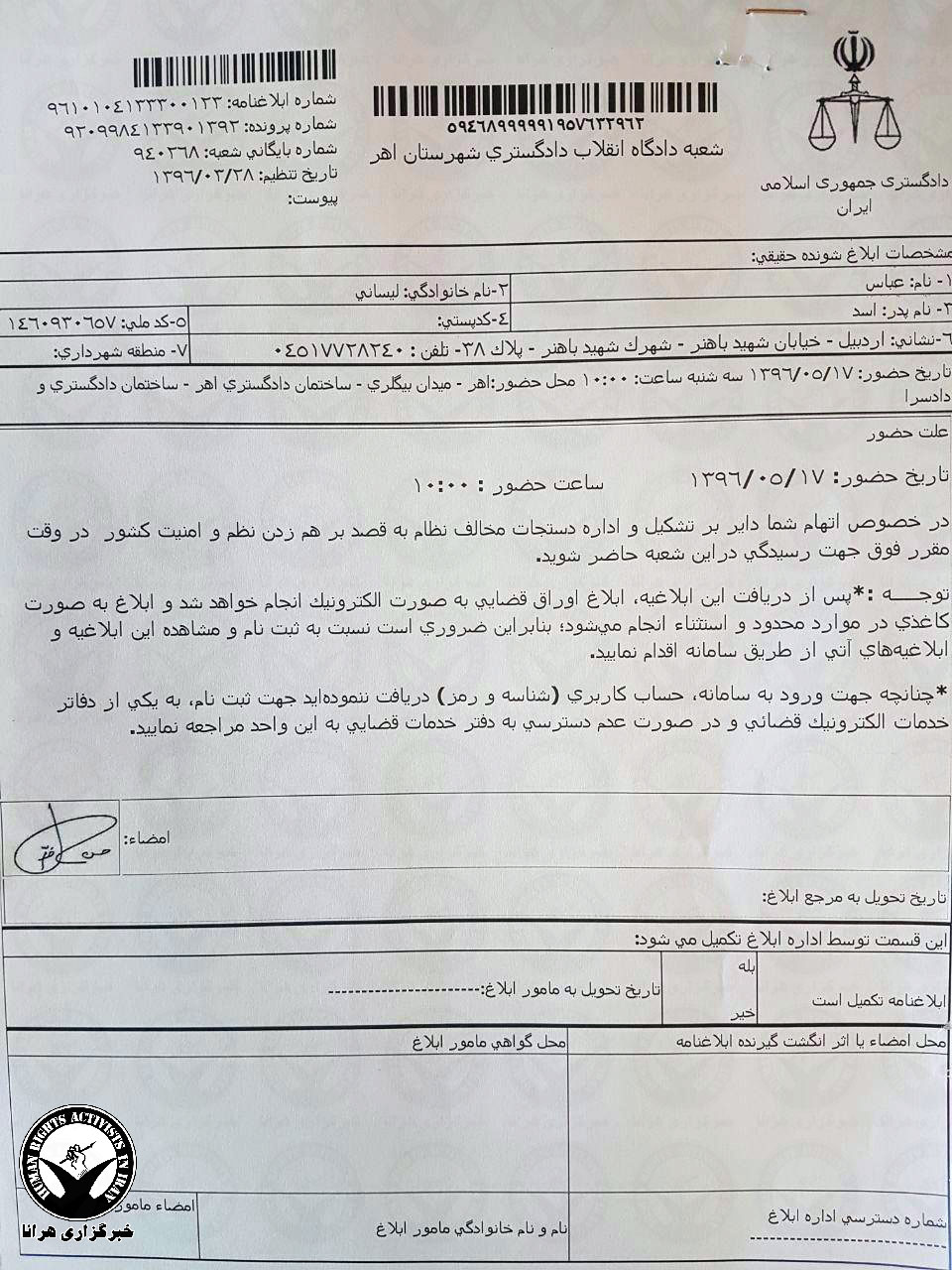 گزارش خبرگزاری هرانا دادگاه انقلاب اهر با ارسال احضاریهای، از عباس لسانی فعال ترک (آذری)