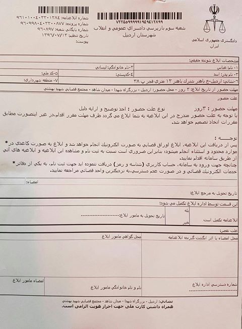 بر اساس ابلاغیه صادره از دادگاه عمومی و انقلاب اردبیل، عباس