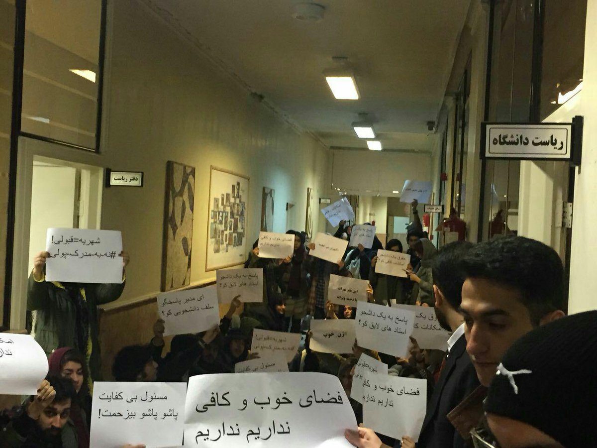 تجمع دانشجویان دانشگاه هنر تهران مقابل دفتر ریاست در اعتراض به پولی سازی آموزش و مشکلات عمرانی، آموزشی، فرهنگی، مالی و رفاهی این دانشگاه #براندازم #