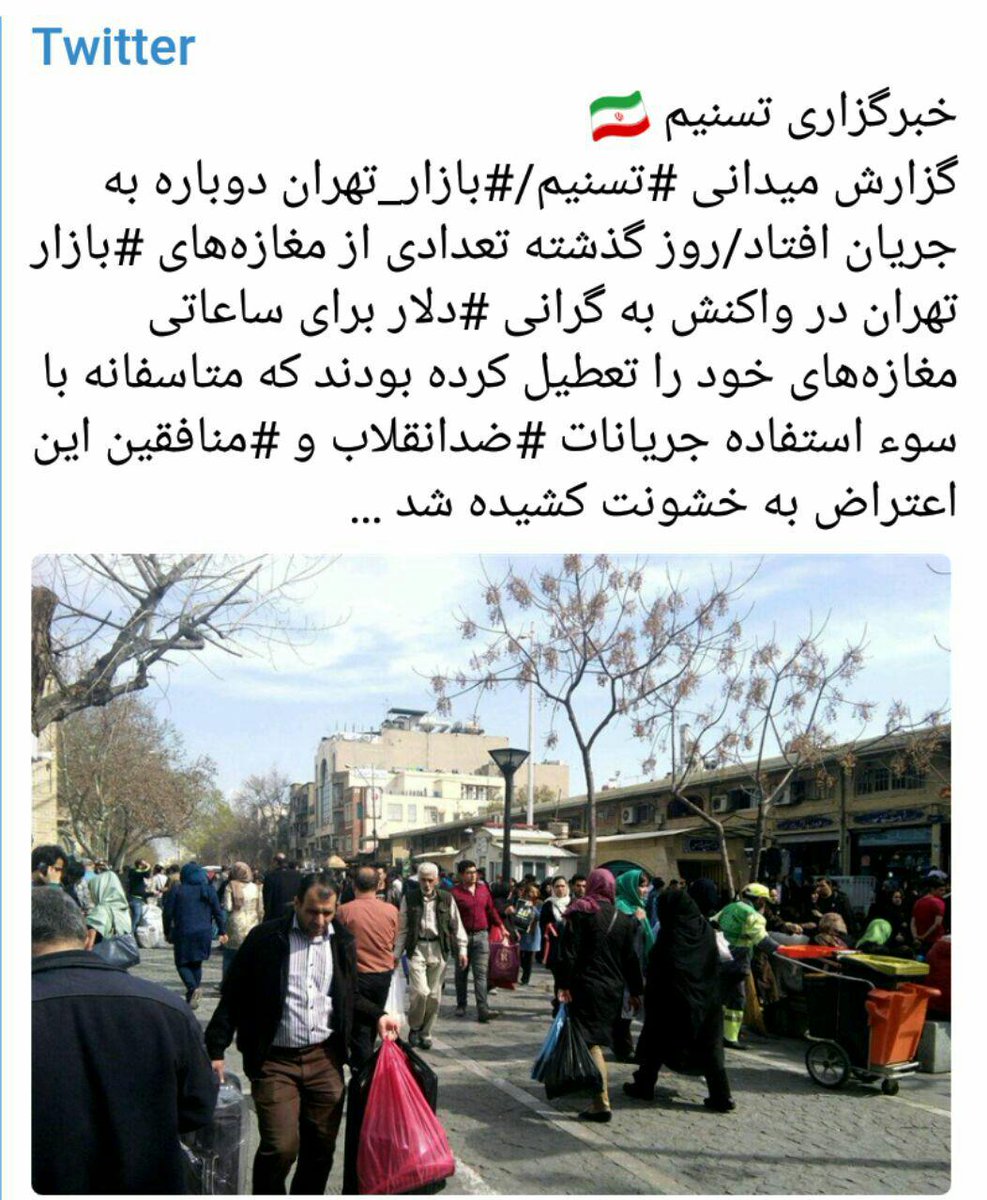 ببینید تسنیم خبرگزاری سپاه امده مثلا قیام بازار تهران جمع کنه چه سوتی داده عکس زمستون رو با درخت های بی برگ و مردم با کاپشی گذاشته که بگه الان خبری نیست #اعتصاب_سراسری #تظاهرات_سراسرى
