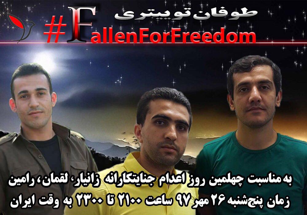 طوفان توییتری به مناسبت چهلمین روز اعدام جنایتکارانه زانیار،لقمان،رامین پنج شنبه 26 مهر ماه ساعت 21 تا 23 به وقت ایران #FallenForFreedom