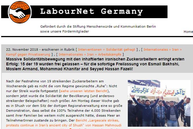 Massive solidarity movement with imprisoned Iranian Haft Tapeh sugarcan workers achieves first success: 15 of the 19 were released - for the immediate release of Esmail Bakhshi, Moslem Armand, Mohammad Khanifar and Seyyed Hassan Fazeli! #IranProtests http://www.labournet.de/interventionen/solidaritaet/massive-solidaritaetsbewegung-mit-den-inhaftierten-iranischen-zuckerarbeitern-erringt-ersten-erfolg-15-der-19-wurden-frei-gelassen-fuer-die-sofortige-freilassung-von-esmail-bakhshi-moslem/