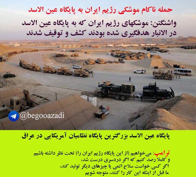 واشنگتن: موشکهای رژيم #ایران که به پایگاه #عین_الاسد در #الانبار هدفگیری شده بودند کشف وتوقیف شدند آمریکا مسئولیت حمله را مستقیما برعهده تهران دانست